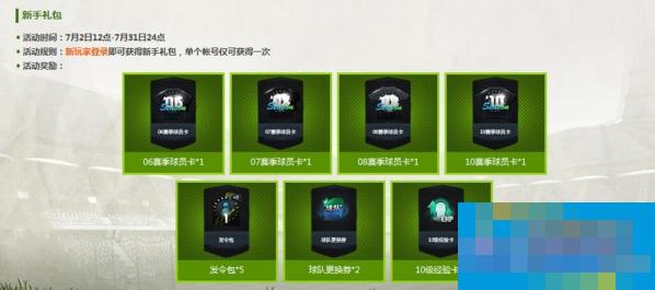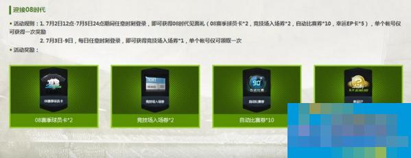 1. 7月2日12点-7月5日24点期间任意时刻登录,即可获得08时代见面礼(08赛季球员卡*2,竞技场入场券*2,自动比赛券*10,幸运EP卡*5),单个帐号仅可获得一次奖励
