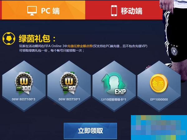 玩家在活动期间在FIFA Online 3中充值任意金额(仅支持在PC端充值,且不包含充值VIP)可领取绿茵礼包一份,每个帐号只能领取一次;