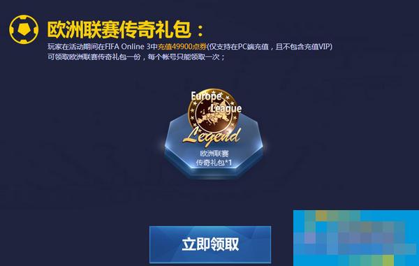 可领取欧洲联赛传奇礼包一份,每个帐号只能领取一次;