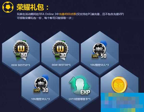 玩家在活动期间在FIFA Online 3中充值49元(仅支持在PC端充值,且不包含充值VIP)可领取荣耀礼包一份,每个帐号只能领取一次;